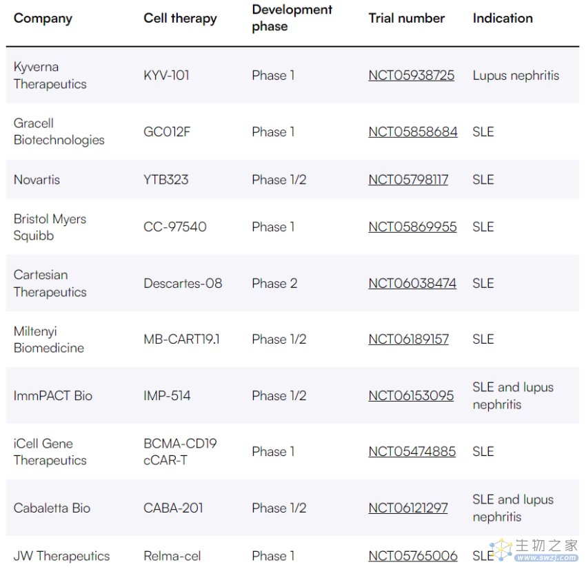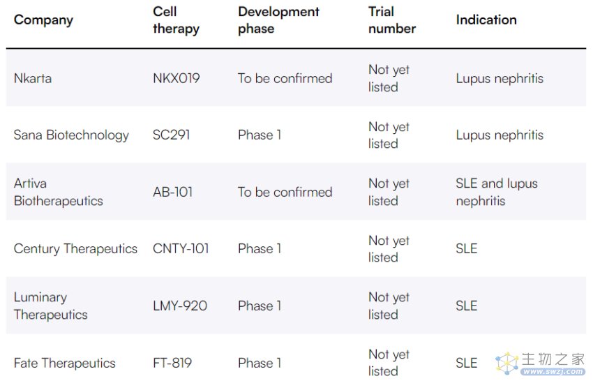 ▲图|目前处于临床试验中的部分狼疮细胞疗法和公司(来源:BiopharmaDive)