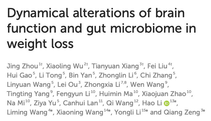 634-10-20 17:08:59 来源:生物世界郑州大学人民医院、中国人民解放军总医院、中国科学院微生物研究所、阜外华中心血管病医院的研究人员在 Frontiers in Cellular and Infection Microbiology 期刊发表了题为:Dynamical alterations of brain function and gut microbiome in weight loss 的研究论文。