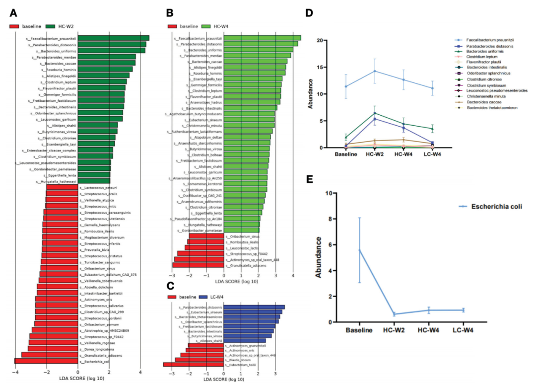 该研究还观察到IER后,与食欲和成瘾调节相关的脑区活动减少。在肠道微生物群落中,Faecalibacterium prausnitzii、Parabacteroides distasonis和Bacterokles uniformis的丰度急剧增加,而大肠杆菌的丰度则下降。进一步的分析表明,大肠杆菌、Coprococcus comes和Eubacterium hallii的丰度与大脑左眶额下回的活动呈负相关,该区域在执行功能中起着关键作用,包括我们的减肥意愿。相比之下,Parabacteroides distasonis和Flavonifractor plautii的丰度与与注意力、运动抑制、情感和学习相关的大脑活动区域呈正相关。