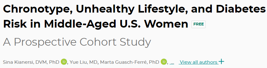 但是熬夜和早起究竟哪一个对我们身体的伤害更大呢?一项来自美国的前瞻性队列研究表明,熬夜晚睡更有可能有不健康的生活方式行为并患上糖尿病。该研究题为“Chronotype, Unhealthy Lifestyle, and Diabetes Risk in Middle-Aged U.S. Women”,发表在Annals of Internal Medicine杂志。
