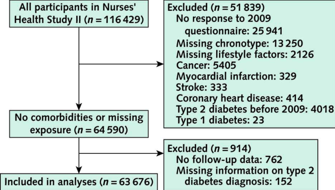 前瞻性分析中,研究人员在 469,120 人的年随访期间记录了 1925 例糖尿病病例,结果发现,与早起型人群相比,夜间睡眠型人群患糖尿病的风险最高。