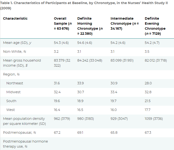 目前仍解释不清早晨和夜间睡眠时间型之间的代谢差异在多大程度上可以归咎于其行为差异。因此,这项调查的目的旨在研究可改变的生活方式因素在睡眠时间型和糖尿病风险之间的作用。具体来说,是研究美国中年女性的睡眠时间类型与生活方式因素之间的关联,并在考虑可改变的生活方式行为后评估夜间睡眠时间类型与糖尿病风险之间关系的变化。