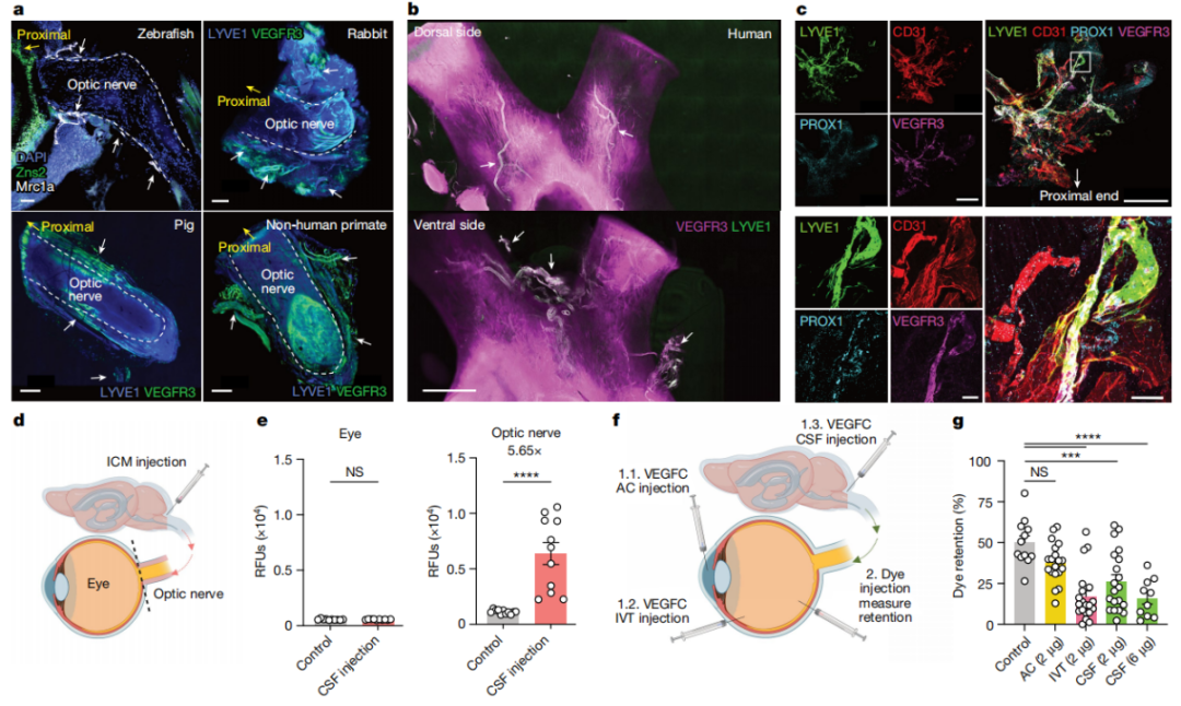 接下来,研究人员对眼脑免疫的机制进行了探索。将荧光标记的右旋糖酐注射入小鼠的眼睛前房或IVT内,可以发现眼内的前房和玻璃体之间存在分隔引流系统。继续标记与视神经相关的淋巴管网络,研究人员观察到淋巴管系统是位于神经周围的膜上,而不是神经本身,并且小鼠视神经鞘中存在淋巴管,IVT途径注射的荧光示踪剂和抗体可以通过脑脊液进入视神经鞘淋巴管,血管内皮生长因子C(VEGFC)可以使IVT引流增加。