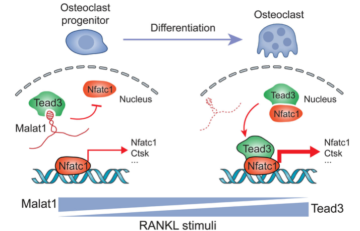 总之,本研究发现Malat1是一种抑制骨质疏松和骨转移的lncRNA,在rankl触发的破骨细胞发生过程中下调。RANKL刺激多种信号通路,其中大部分通路可被其他因子激活,但RANKL在破骨细胞发生中是不可缺少和不可替代的。研究者确定了Tead3是巨噬细胞破骨细胞特异性的Tead家族成员和Nfatc1的结合伙伴。