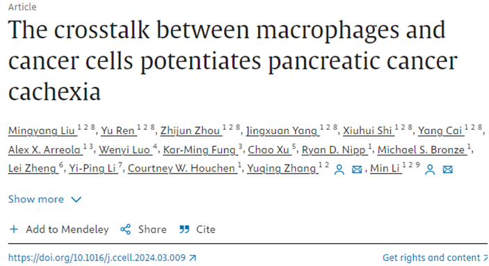 相关研究结果于2024年4月11日在线发表在Cancer Cell期刊上,论文标题为“The crosstalk between macrophages and cancer cells potentiates pancreatic cancer cachexia”。