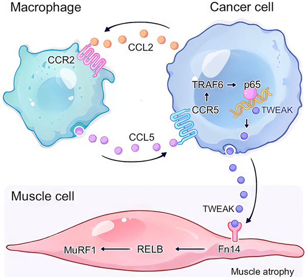 两者间的交流进一步激发了TWEAK蛋白(一种与凋亡类似的TNF家族成员)的分泌增多,而此蛋白一旦与肌肉细胞表面的受体相结合,便会引发炎症反应,进而加剧恶病质的发展进程。