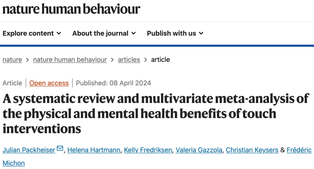 2024-05-06 14:17:17近日,由德国波鸿鲁尔大学Julian Packheiser领衔的研究团队,在著名期刊《自然·人类行为》上发表一项重要研究成果。他们基于大规模、多层次、多变量的荟萃分析,系统地探讨了触摸干预对身心健康的影响,以及哪些调节因素会影响干预的效果。