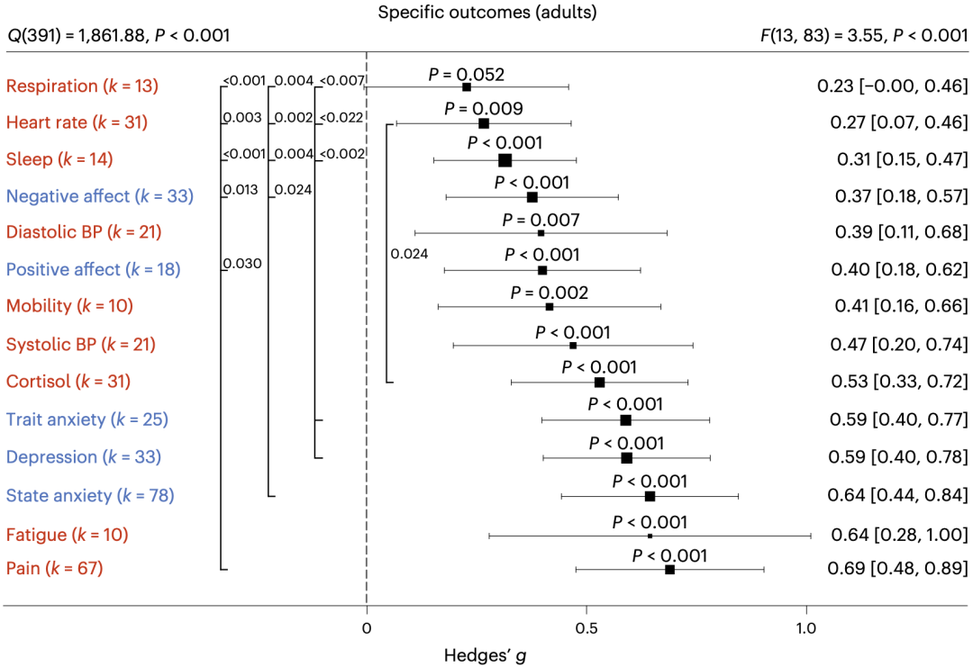从更细分的健康指标来看,在成人中,触摸对睡眠和心率参数的益处较小,对积极和消极情绪、舒张压和收缩压、活动能力和应激激素皮质醇减少的益处中等,对特质/状态焦虑、抑郁、疲劳和疼痛的益处较大。