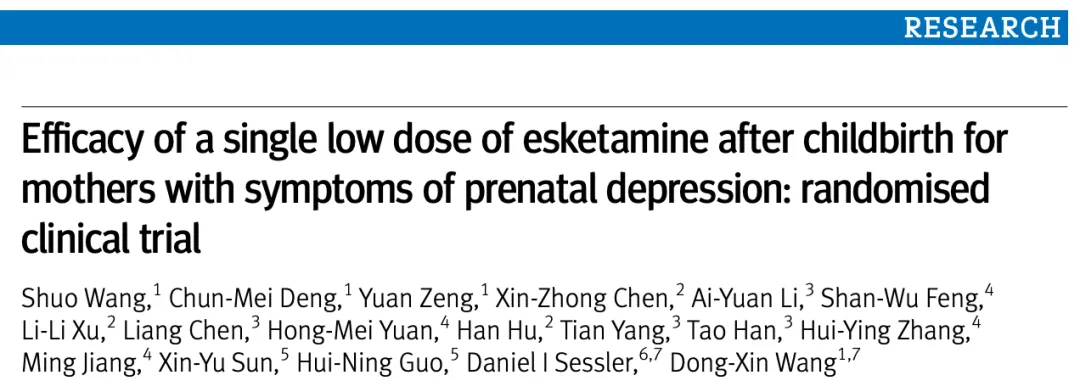 近日,北京大学第一医院麻醉科王东信教授团队在医学期刊 The BMJ 发表了题为:Efficacy of a single low dose of esketamine after childbirth for mothers with symptoms of prenatal depression: randomised clinical trail 的研究论著。