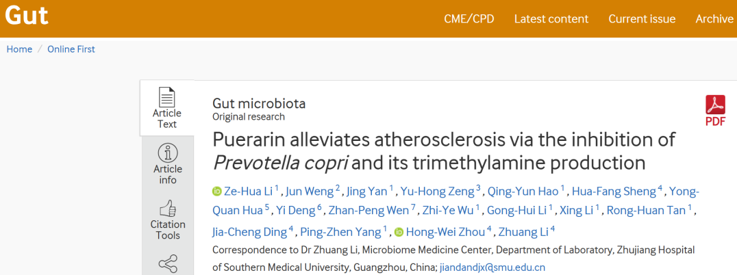Gut | 再添益处!南方医科大学李壮团队发现葛根素缓解动脉粥样硬化的潜在机理