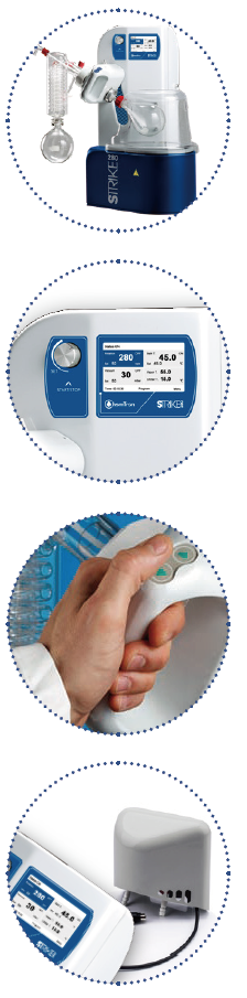 产品描述 Strike 280 旋转蒸发仪 快速、稳定和易用。 提供良好的分离,浓缩和纯化解决方案。 Strike 280 配备计时器,程序控制,自动提升等功能。 更多的安全措施,包括:过热设置和保护,断电时自动起升,实时监测蒸汽和冷却水温度等。